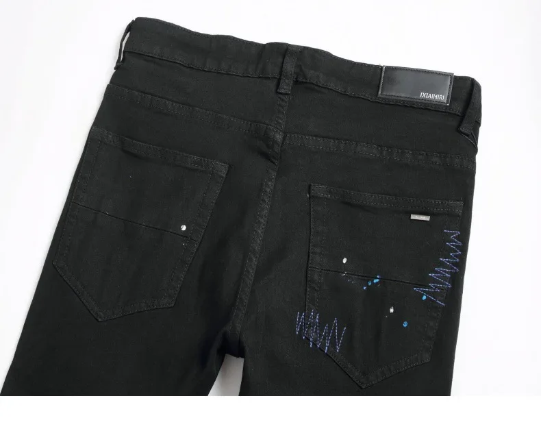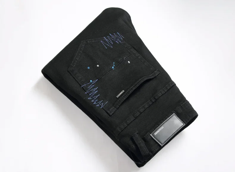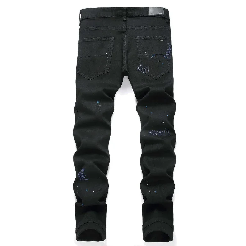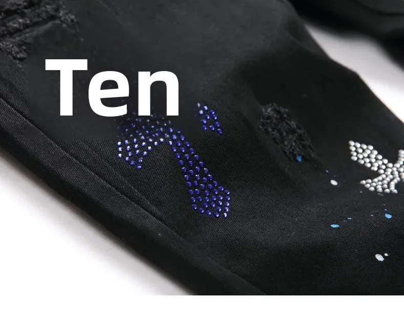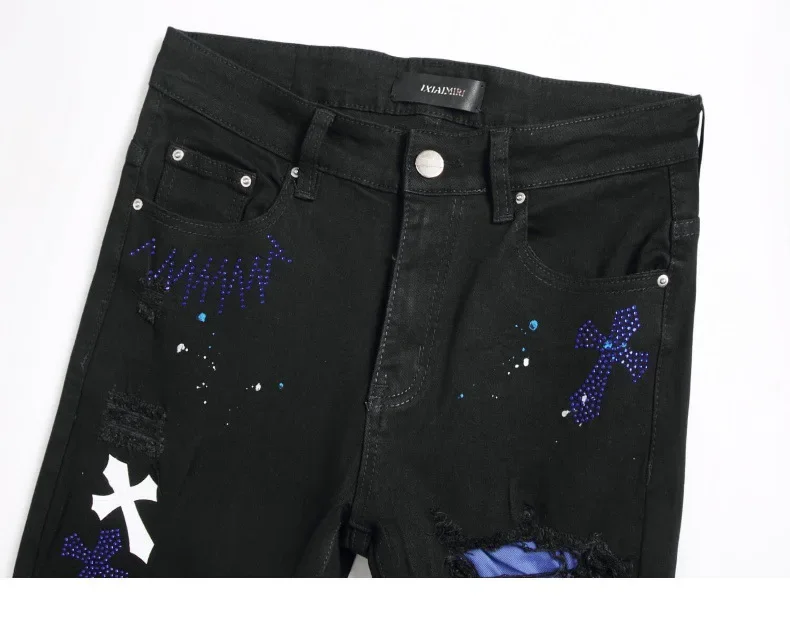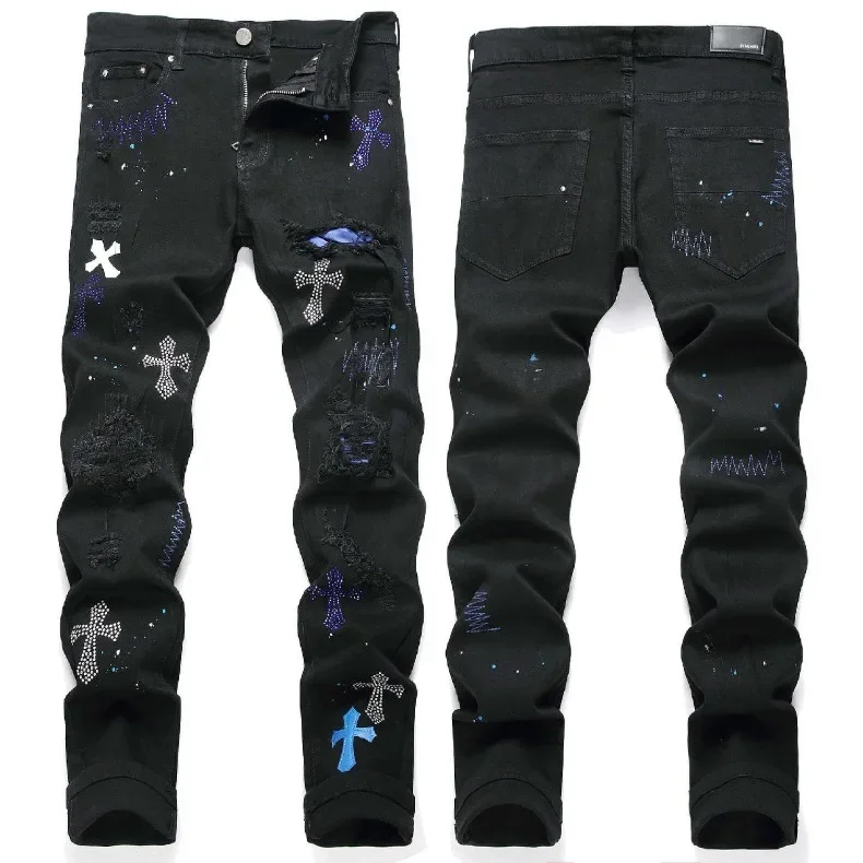 Black Cross Emblem Rhinestone Hole Denim Jeans Men's Slim Fit Casual Long Trousers Trendy Brand High Street Style